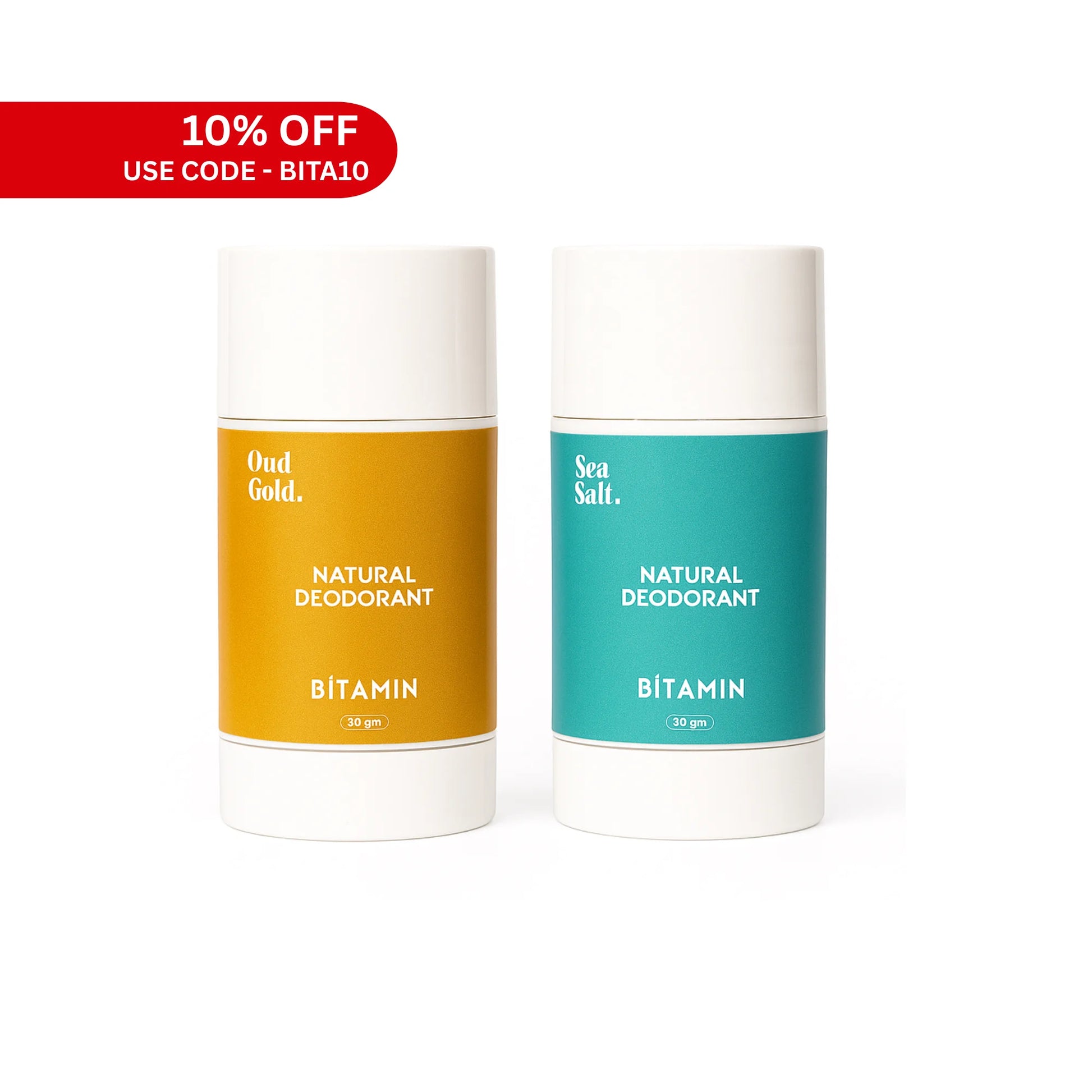 Men pack from Bitamin natural deodorant is a blend of both Sweet allure of gold and the enchanting Arabic fairy tales and on other deo stick its fragrance of nature sea with inspired ocean waves salt .